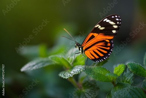 Fototapeta premium A delicate butterfly with vibrant orange and black wings rests gracefully on...
