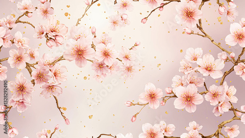 © Namhom, Fototapeta premium A delicate cherry blossom seamless pattern with soft pink sakura flowers in full bloom, detailed petals with gentle shading, and scattered golden speckles for an elegant touch
