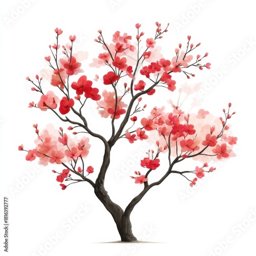 © bajita111122, Fototapeta premium A delicate cherry blossom tree with vibrant red and pink flowers blooming on dark brown branches against a white background.