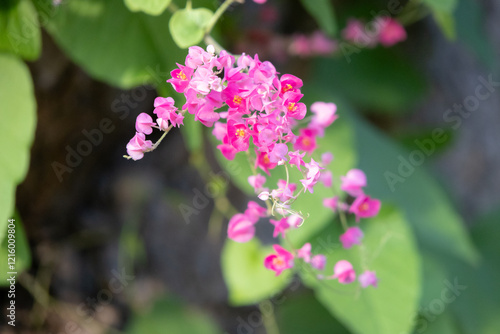 © pandaclub23, Fototapeta premium A delicate cluster of pink flowers intertwined on a vine, with a bee busily gathering nectar