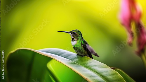 © Gasspoll, Obraz premium A Delicate Colibri Perched on a Green Leaf Amidst a Verdant Tapestry of Foliage on blurred background. Generative AI