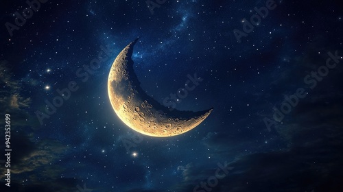 Fototapeta premium A delicate crescent moon glowing softly against a dark night sky, with a few scattered stars around it. The serene scene leaves ample room for text.