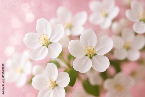 Fototapeta premium A delicate dance of white blossoms against a pink backdrop, capturing the...