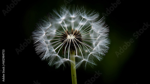 Fototapeta premium A delicate dandelion seed head with fluffy white seeds against a dark background
