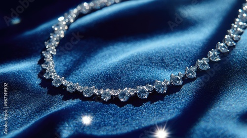© Nuttaya Nampai, Obraz premium A delicate diamond necklace lying on a velvet blue surface, captured from above, each gemstone sparkling brilliantly in the soft lighting