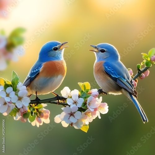 Fototapeta premium A delicate digital illustration of two bluebirds perched on a branch of white blossoms, set against a soft natural background with warm sunlight. This romantic and serene design is ideal for spring de