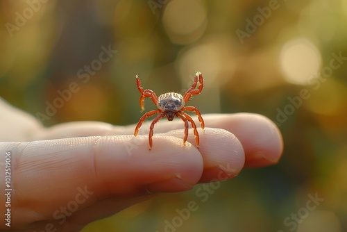 © Valentin, Obraz premium A Delicate Encounter: A Tiny Spider Perched on a Finger in Nature's Glow