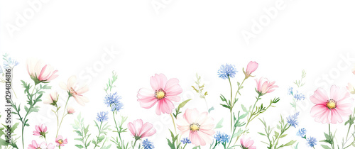 © Floral, Fototapeta premium A delicate floral border featuring pink and blue flowers on a white background.