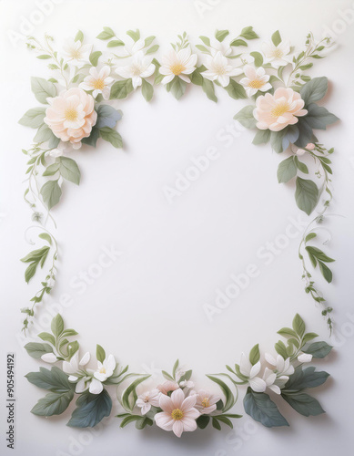 Naklejka premium A delicate floral border with soft very light white pink flowers and green leaves, creating an elegant frame. It is ideal for invitations, wedding stationery, and greeting cards.