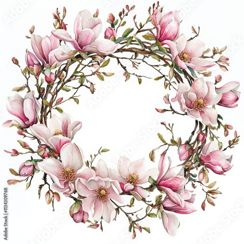 © KP, Obraz premium A delicate floral wreath featuring pink magnolia blossoms arranged in a circular pattern, creating a soft and elegant design.