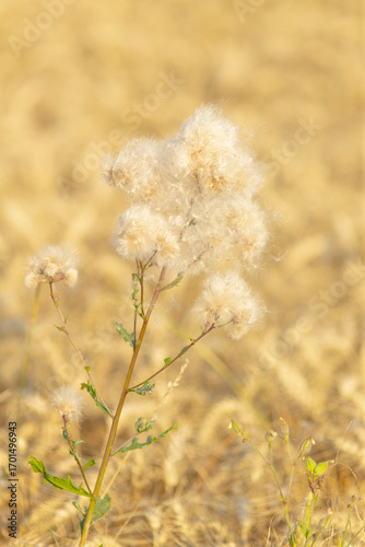 Fototapeta premium A delicate, fluffy white flower stands tall in a golden field, showcasing the...
