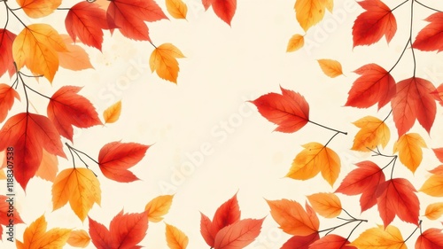 © BokehBox, Fototapeta premium A Delicate Frame of Fall Leaves in Vibrant Hues of Red and Yellow on a Soft Beige Background