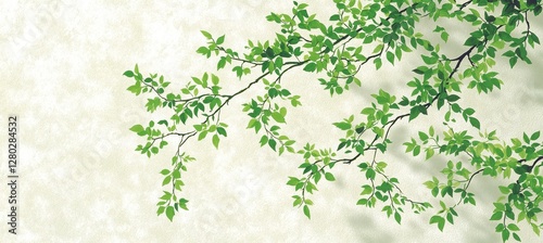 © Manatchaya, Fototapeta premium A delicate green branch with lush leaves against a soft, neutral background, conveying a sense of tranquility and nature.