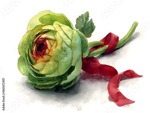 © Anuson, Obraz premium A delicate green flower with a deep red center rests elegantly with a vibrant red ribbon on a white background.
