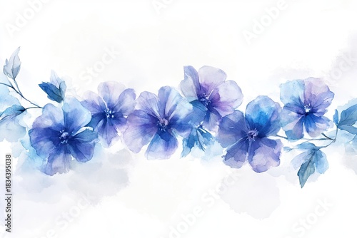 © DnQajik, Fototapeta premium A delicate horizontal arrangement of soft watercolor-style blue and purple flowers