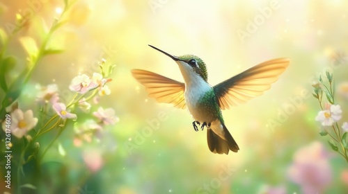 © Gambar Upi, Fototapeta premium A Delicate Hummingbird Fluttering Near Blossoming Flowers In Sunlight