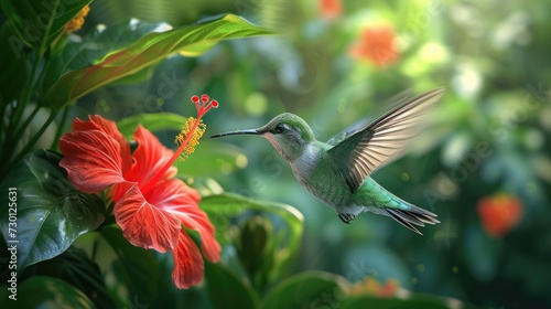 Fototapeta premium A delicate hummingbird hovers effortlessly near a vibrant red hibiscus,...