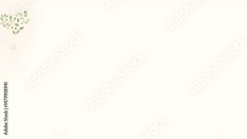 © THANAT SAINAK, Obraz premium A delicate illustration featuring a soft pink background with a gentle cloud-like frame and a single green leafy branch in the upper left corner.