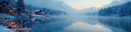 Fototapeta premium A delicate mist rises above a tranquil landscape with twinkling golden Christmas lights reflected in the calm surface of a frozen lake, winter wonderland, ice, serene landscape