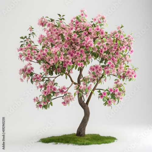 © Mr image, Fototapeta premium 55. "A delicate peach tree with pink blossoms and lush green foliage, depicted in 3D on a white background."