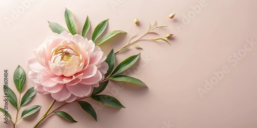 Naklejka premium A delicate peony flower blooms on a soft pastel pink paper background, surrounded by intricate greenery and subtle golden accents , blooms, spring flowers