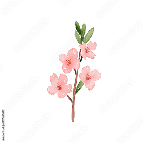 © kiimoshi, Obraz premium A delicate pink flower branch with green leaves on a white isolated background, perfect for floral designs and nature-themed projects.
