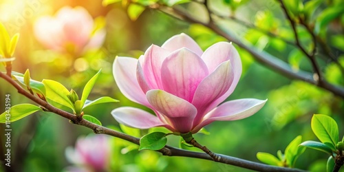 Fototapeta premium A delicate pink magnolia flower blooms in a lush garden amidst green leaves and branches, magnolia, garden, magnolia