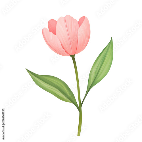 © ZethX, Fototapeta premium A delicate pink tulip with smooth petals and vibrant green leaves.