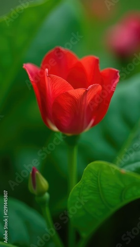 Fototapeta premium A delicate red bloom nestled within a large green leaf, garden elements, flowers