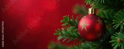 Fototapeta premium A delicate red-gold star hangs from a Christmas tree branch, red, evergreen, tree
