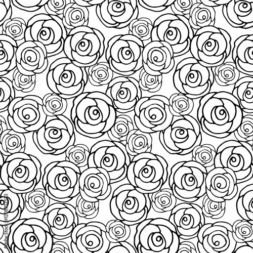 © Oksana, Obraz premium A delicate, repeating pattern featuring small black roses on a pristine white background. Ideal for creating an elegant and minimalist aesthetic