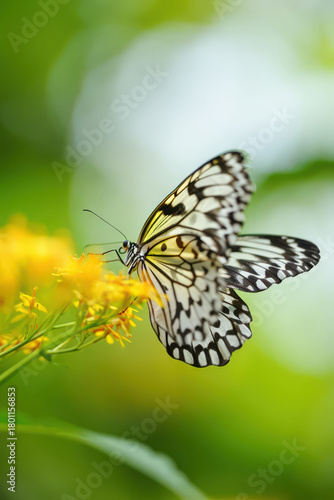 © Mst, Fototapeta premium A Delicate Rice Paper Butterfly Sipping Nectar from a Vibrant Cluster of Yellow Flowers in a Lush Green Garden with Soft, Diffused Light Creating a Peaceful Atmosphere