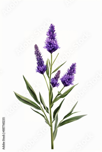 Naklejka premium A delicate sprig of purple flowers with long, slender leaves on a white...