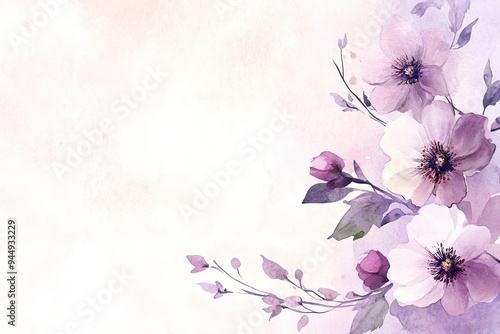 © 6ixpoint6, Naklejka premium A delicate watercolor floral design showcasing beautiful purple flowers against a soft pastel background, perfect for invitations.