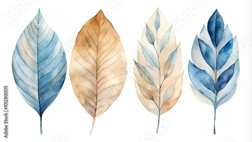 © Jane Studio, Obraz premium A Delicate Watercolor Illustration Featuring Four Abstract Leaves in Hues of Blue and Brown, Each With Unique Shapes and Veining, Isolated on a White Background