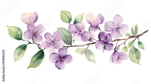 © Boinah, Fototapeta premium A delicate watercolor illustration of purple flowers on a branch with green leaves.