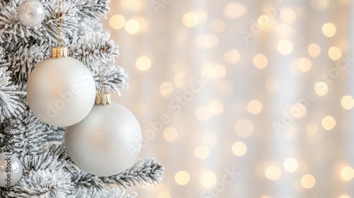 Fototapeta premium A delicate white Christmas ornament dangles from a frosted branch, illuminated by warm bokeh lights, creating a magical ambiance for holiday festivities in winter.
