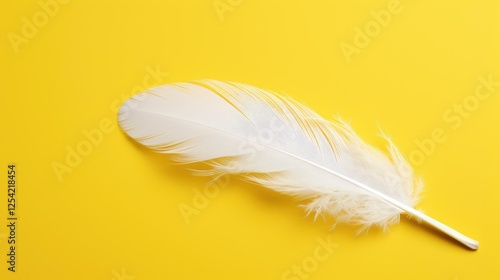 Obraz premium A delicate white feather gracefully rests on a vibrant yellow background,...