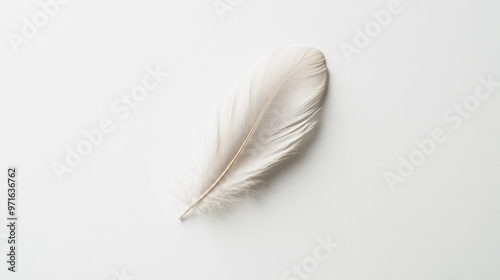 © BerkahStock, Obraz premium A delicate white feather resting on a clean, light background.