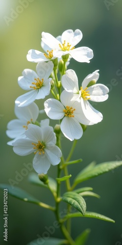 Obraz premium A delicate white flower with yellow stamens, set against a blurred green...