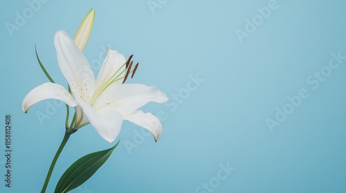 © ArpPSIqee, Obraz premium A delicate white lily on a serene blue background, close-up shot, Minimalist style