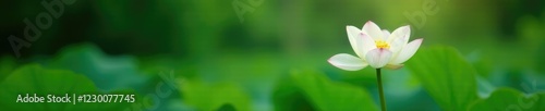 © retirementfun, Fototapeta premium A delicate white lotus lily rises from a bed of greenery, lotus lily, natural