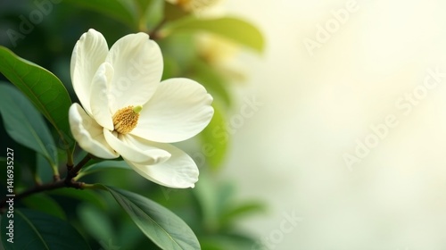 Fototapeta premium A Delicate White Magnolia Blossom in Soft Sunlight, Gracefully Displayed Amongst Lush Green Foliage, Evoking a Sense of Tranquility and Natural Beauty