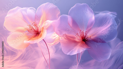 © Natalia, Fototapeta premium A delicate, wispy bouquet of ethereal flowers with translucent petals in pastel pink and lilac, softly glowing against a misty background, isolated on a pastel lavender backdrop,