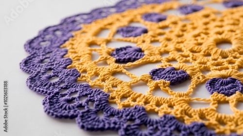 Obraz premium A delicate, yellow and purple crocheted lace doily rests on a white surface....