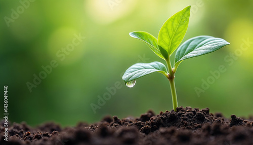 Naklejka premium A delicate young plant with a water droplet on its leaf, sprouting from rich soil, symbolizing growth, freshness, and environmental care