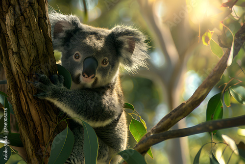 © kashiStock, Fototapeta premium a delighted koala cuddled up in the crook of a tree branch, its fuzzy ears perked up with curiosity