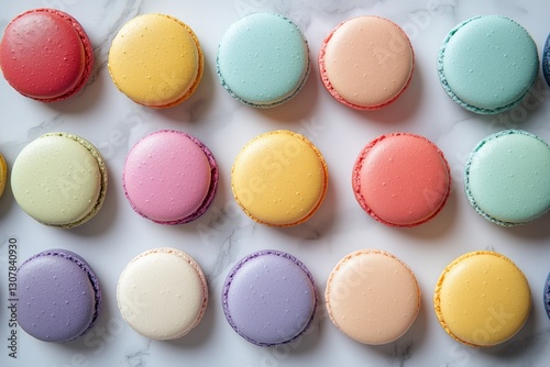 © hkjdesign, Obraz premium A delightful arrangement of colorful macarons on a marble surface.
