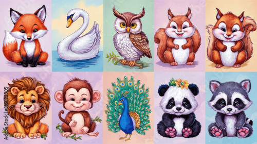© Ivan, Naklejka premium A delightful arrangement of stickers, each featuring adorable and intricately painted animals