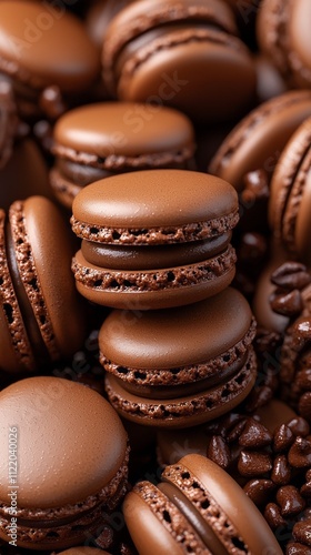 Fototapeta premium A delightful assortment of glossy mocha macarons nestled among aromatic...